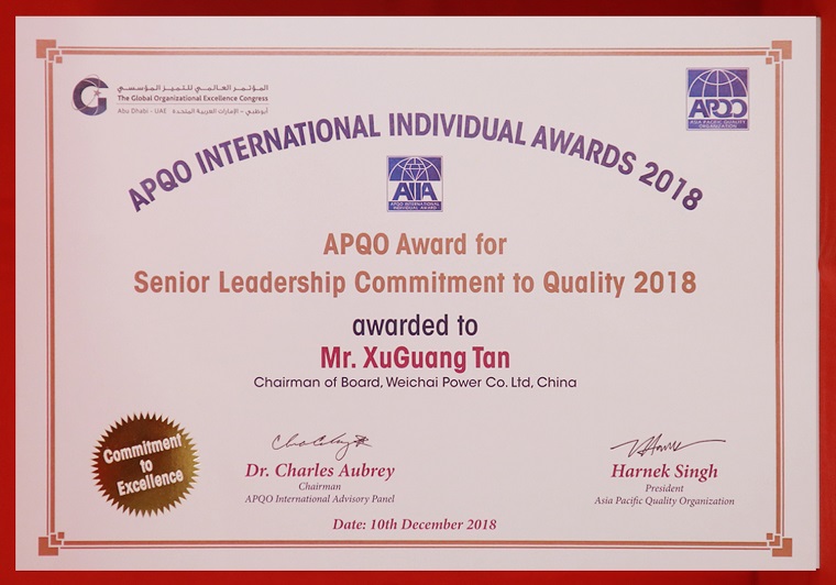 日前,第24屆亞太質量組織國際大會在阿聯酋首都阿布扎比舉行。會上,譚旭光榮膺“2018亞太質量獎個人獎—卓越誠信企業領袖”,濰柴動力榮獲“2018全球卓越績效獎——世界級”。
