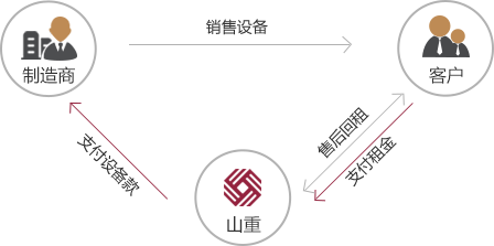 客戶從制造商或經(jīng)銷商處購買物流設(shè)備,再與山重租賃操作售后回租;山重租賃向工廠或經(jīng)銷商代付設(shè)備款,客戶按期向山重租賃支付租金。